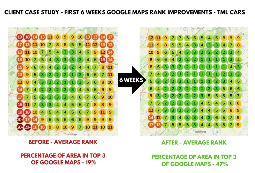 Results after 6 weeks of Google business management and SEO – Still a long way to go but for this major search term top 3 ranking has increased 147% so far