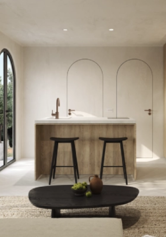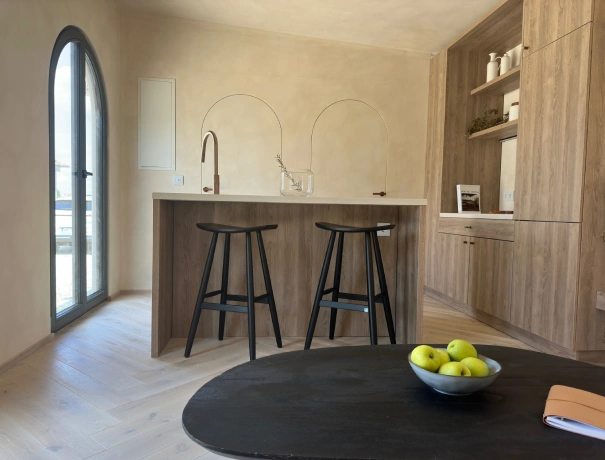 Unleash your culinary creativity in a kitchen adorned with natural materials—wood, bronze faucet, and microcement—creating an environment that resonates with earthy charm.